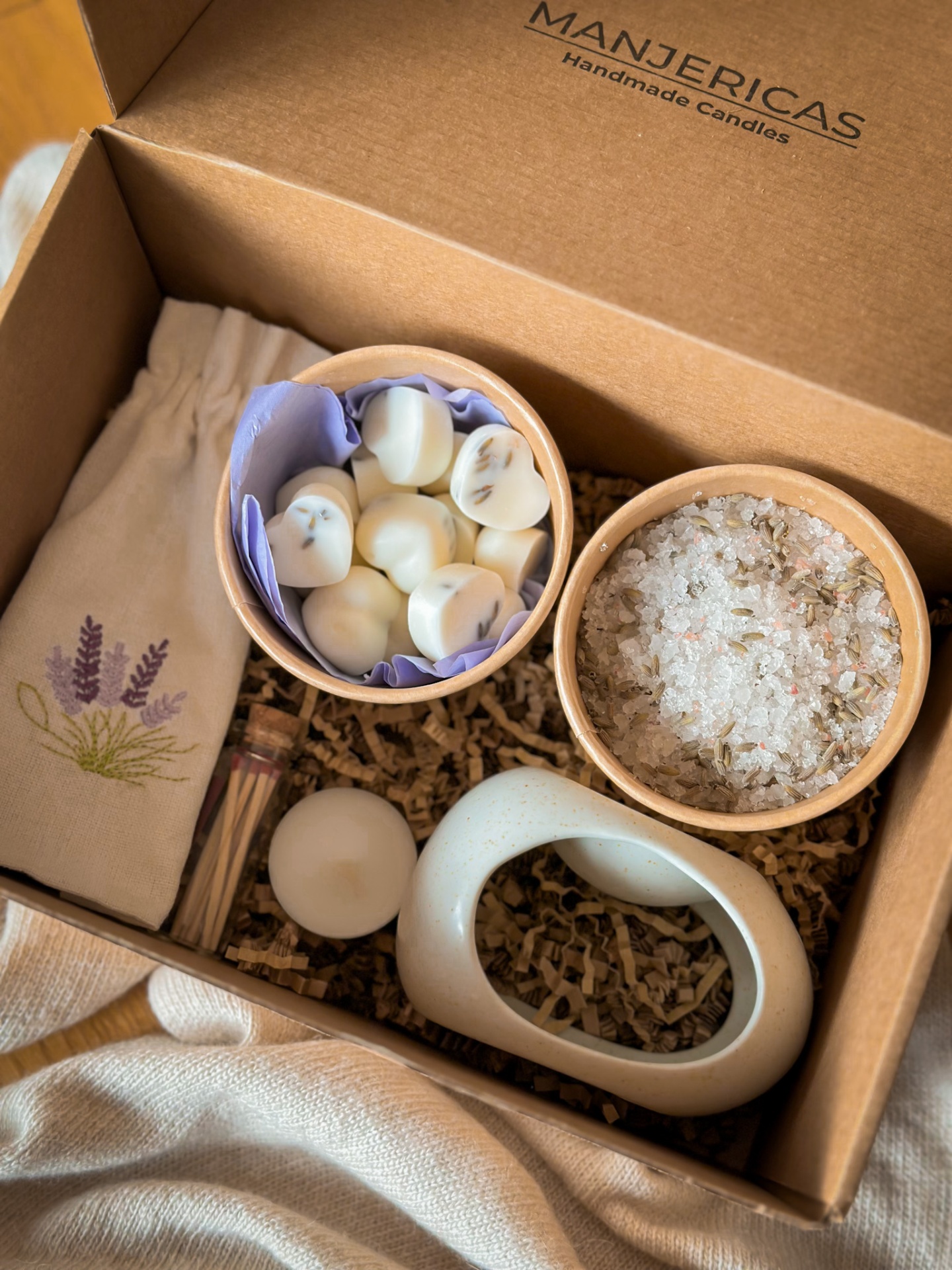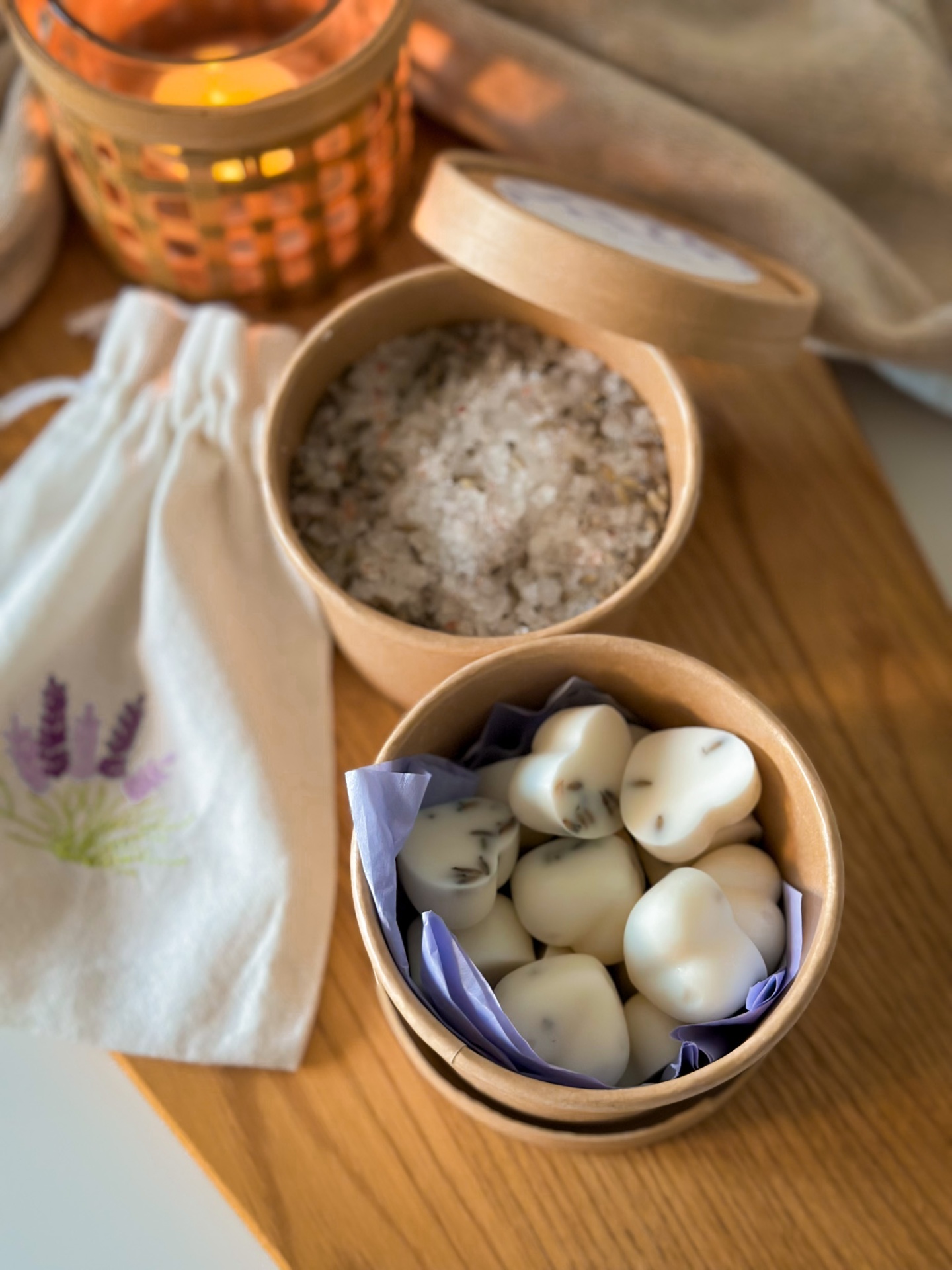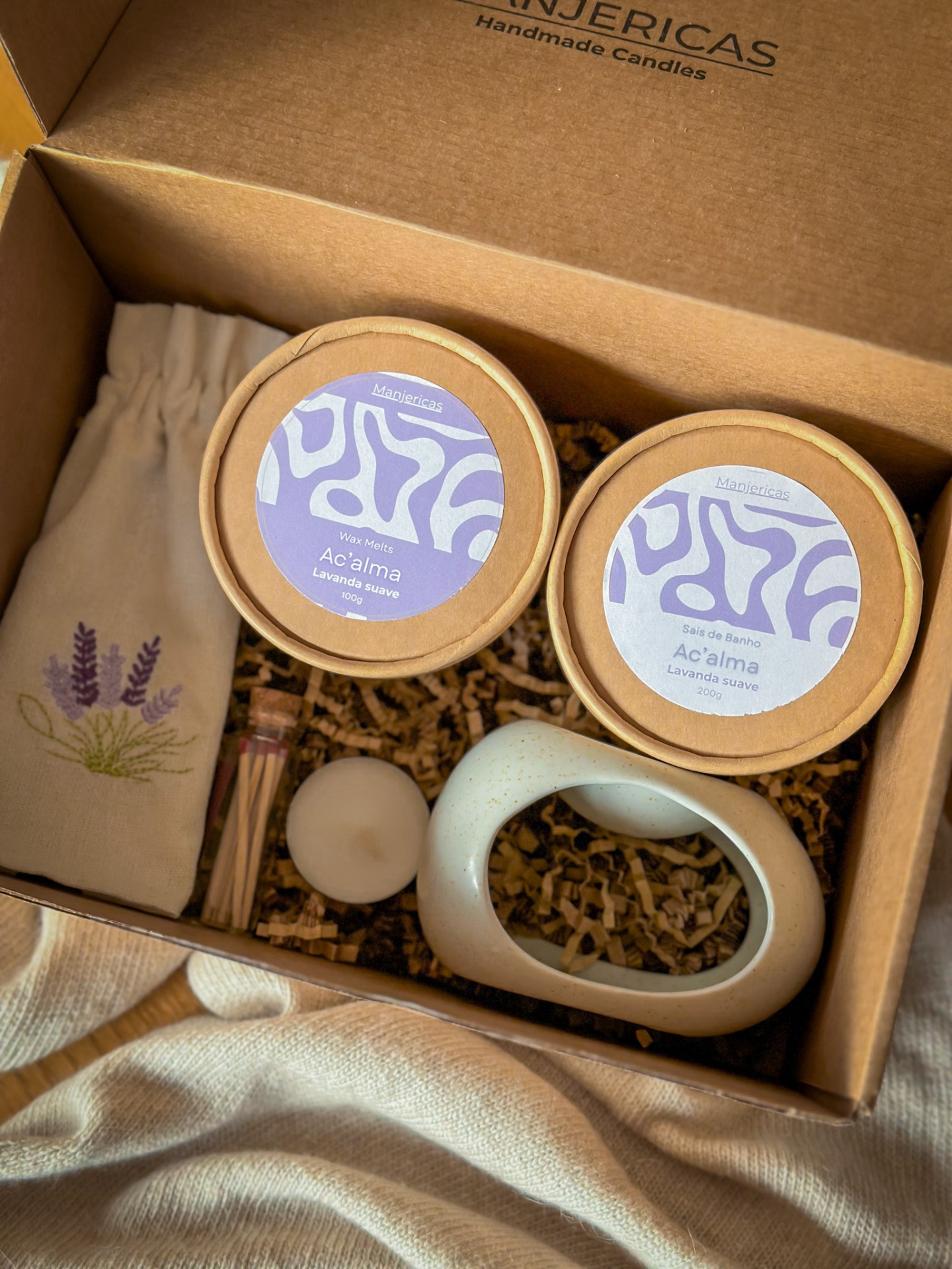 A combinação de sais de banho (Epson, Marinho, Himalaias, óleo essencial de lavanda) e wax melts com aroma de lavanda ajuda a desacelerar, a acalmar a mente e a criar um ambiente mais tranquilo, em poucos minutos.