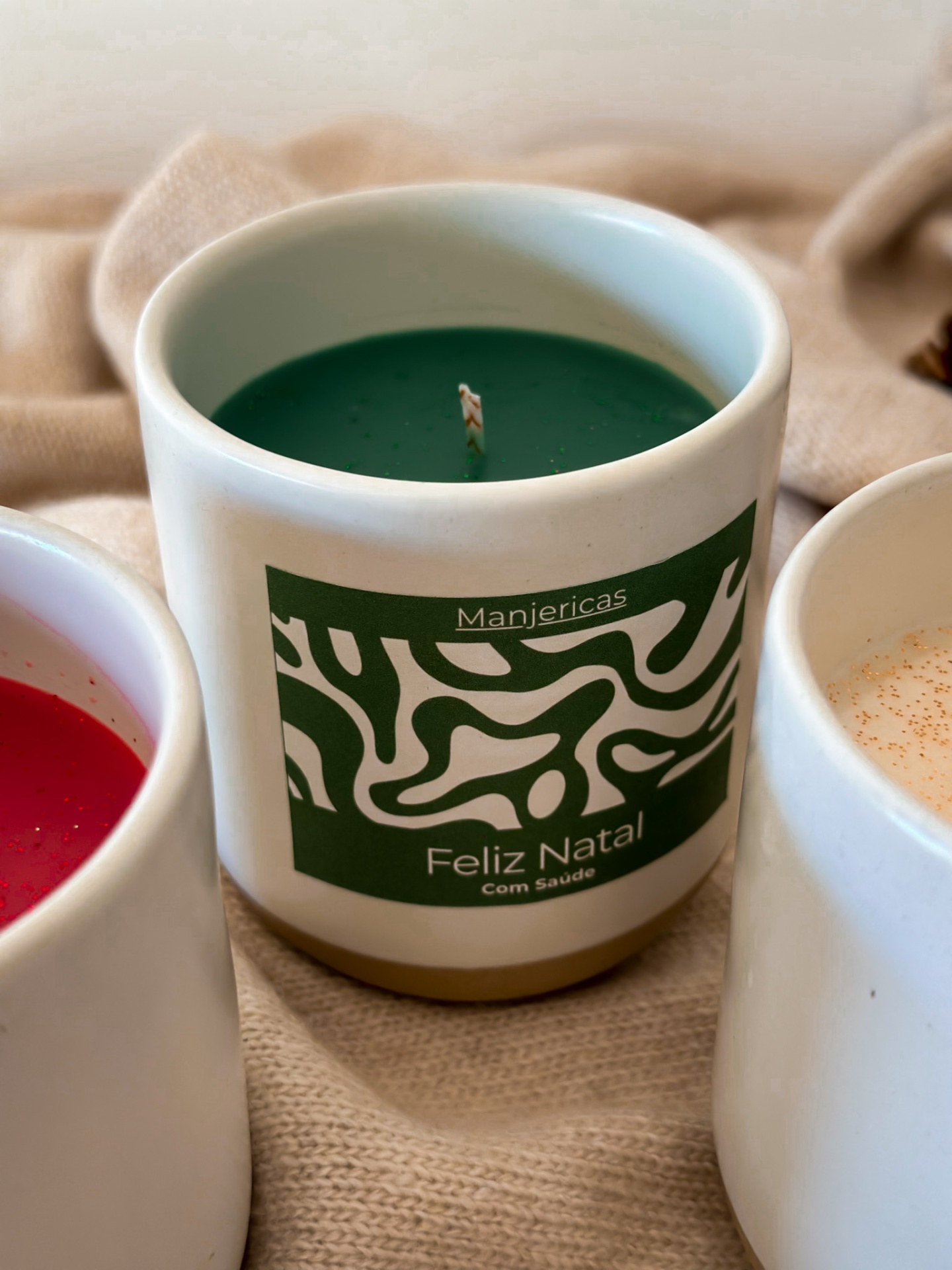 A vela Feliz Natal com Saúde, num copo de cerâmica, traz o aroma verde e puro do pinheiro e do eucalipto, leve, revigorante e com um toque frio, como o ar das manhãs de dezembro.
