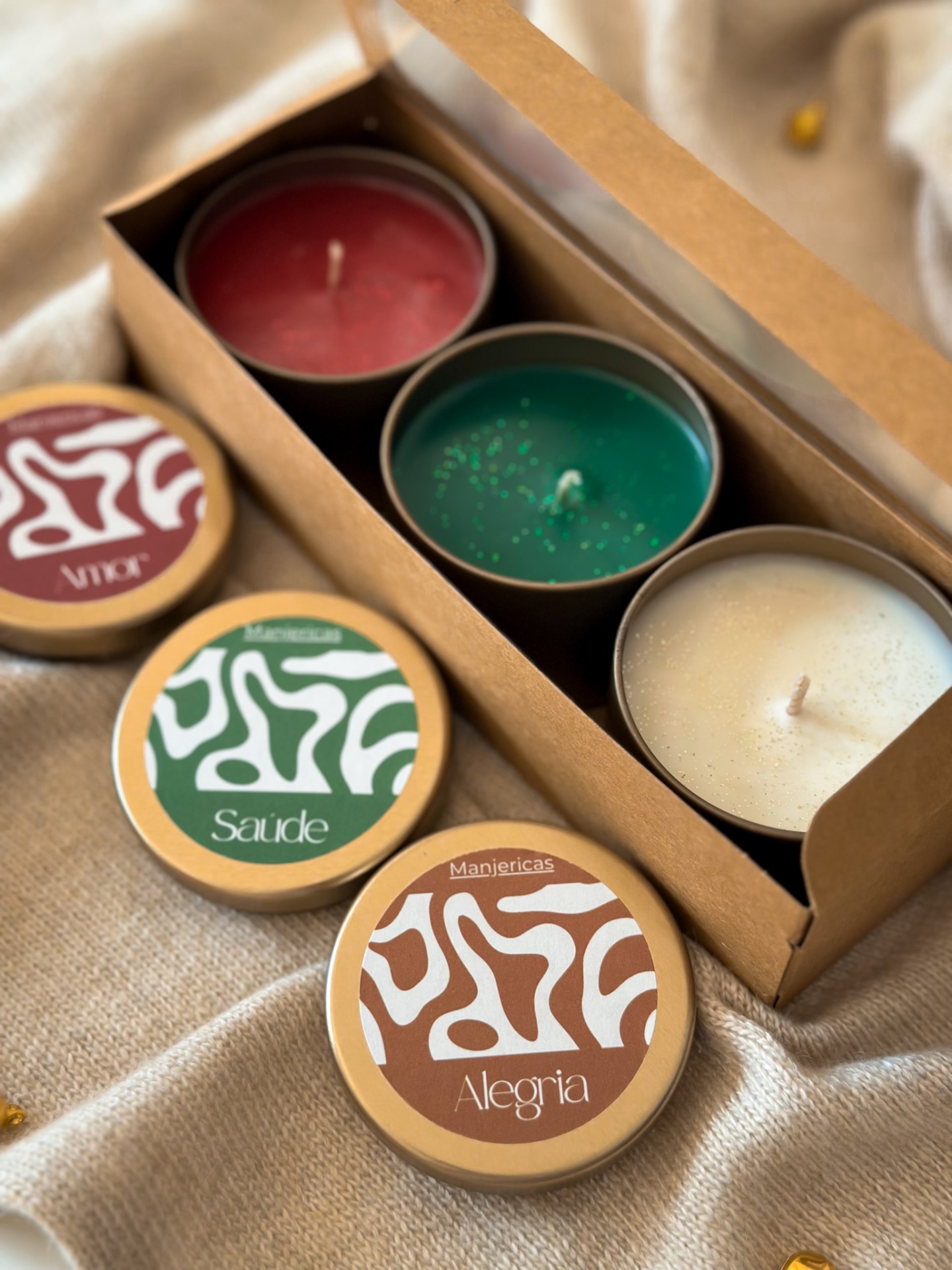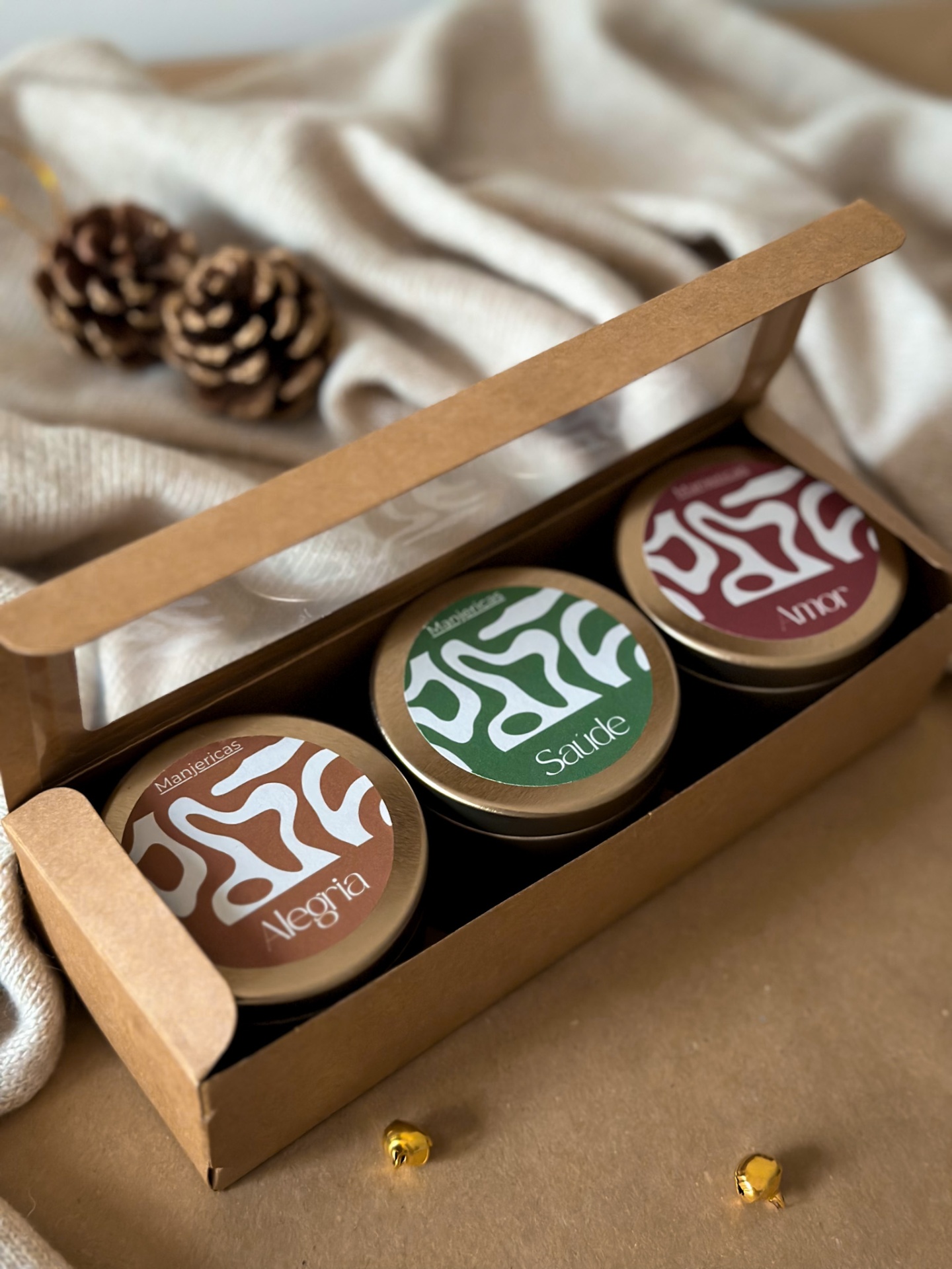 O pack Desejos de Natal reúne três velas em lata — Saúde, Alegria e Amor. Cada uma com um aroma diferente, pensado para despertar memórias e sensações típicas da época.